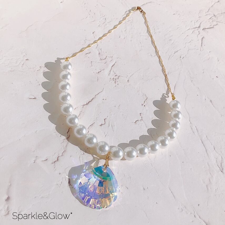 シェル モチーフ スワロフスキー パール チェーン キラキラ ホワイト ゴールド ネックレス